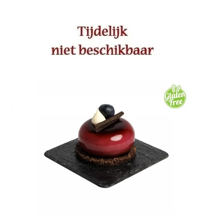 Basis van cacaocrumble, witte chocoladecrème, verrijkt met gepocheerd rood fruit, een bosbessenglazuur en een zachte chocoladebisque.